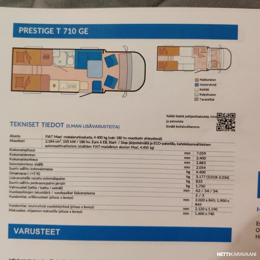 Vaihteisto: Manuaali Polttoaine: Diesel Vetotapa: Etuveto Leveys: 200 cm Pituus: 705 cm Matkustajat: 4 Kokonaismassa: 4 400 kg Oma massa: 3 177 kg Makuupaikat: 4 Ajokortti: C Lämmitys: Ei määritelty