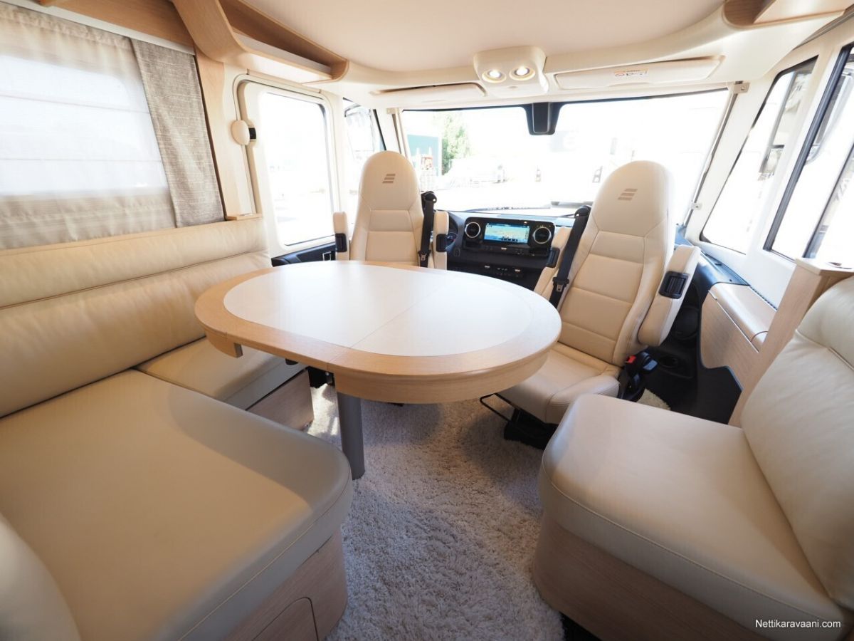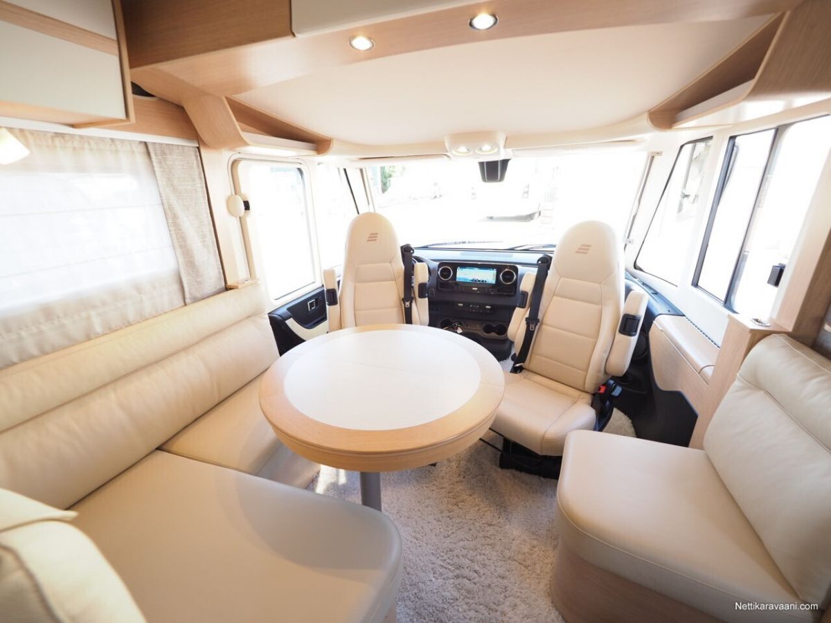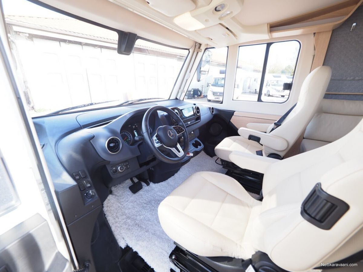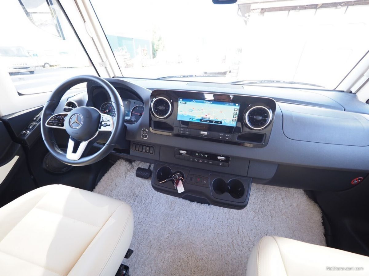 Aj. 43 tkm, Varusteet: automaattivaihteisto 9G-Tronic, ohjaamon ilmastointi, adaptiivinen vakionopeudensäädin, MBUX multimediajärjestelmä (radio, navi, peruutuskamera, bluetooth, ym.), monitoimiohjauspyörä, avaimeton käynnistys, sähköinen pysäköintijarru, nahkaverhoilu, pyöreä levittyvä luxus-pöytä, sähkötoiminen alaslaskeutuva etuvuode, Jumbo-jääkaappi/pakastin, kaasu-uuni, Alde-nestekeskuslämmitys, Alde-lämmönvaihdin, keskuslukitus ovissa ja takatallin luukuissa, ovien turvalukot, takatukijalat, sumuvalot, LED-ajovalot + sumuvalot, ulkosuihku takatallissa, tuulilasin termopeite, ohjaamon termomatto, sähköisesti korkaussäädettävä takavuode, tilava kaksoispohja läpilastausmahdollisuudella, harmaavesisäiliön sähköinen tyhjennysventtiili, Webasto, autom. kaasupullonvaihtaja kaasusuodattimilla, sisällä lisäpistorasiat, keittiössä 2 x kaasuliesi + induktioliesi, asunto-osan Komfort-Plus ovi kiinnivedon tuella ja RFID avaimeton pääsy, wc:n ilmanvaihto, 32" Smat-LED-TV oleskelutilassa ja 22" LED-TV makuutilassa.
