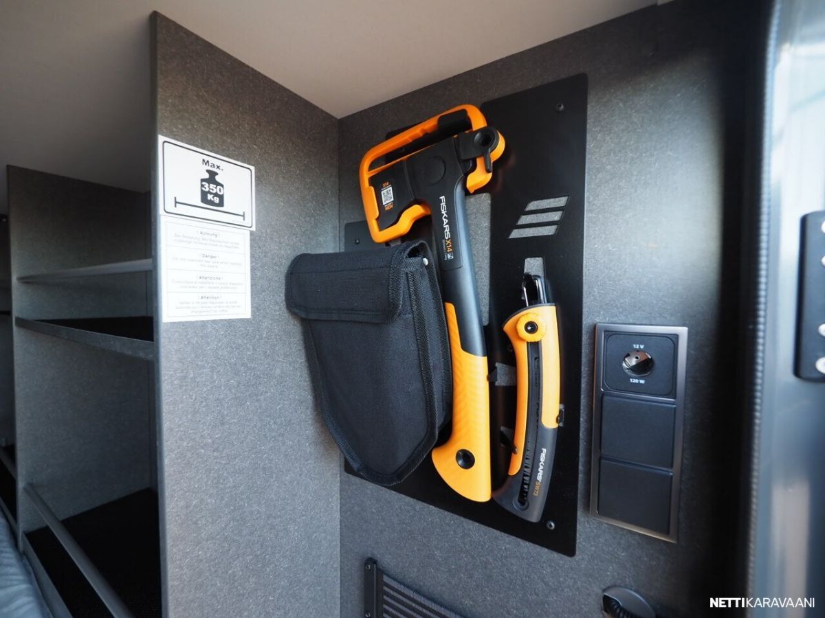 ° Työkalusetti (taittuva lapio, kirves) takana tavaratilassa