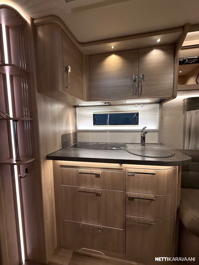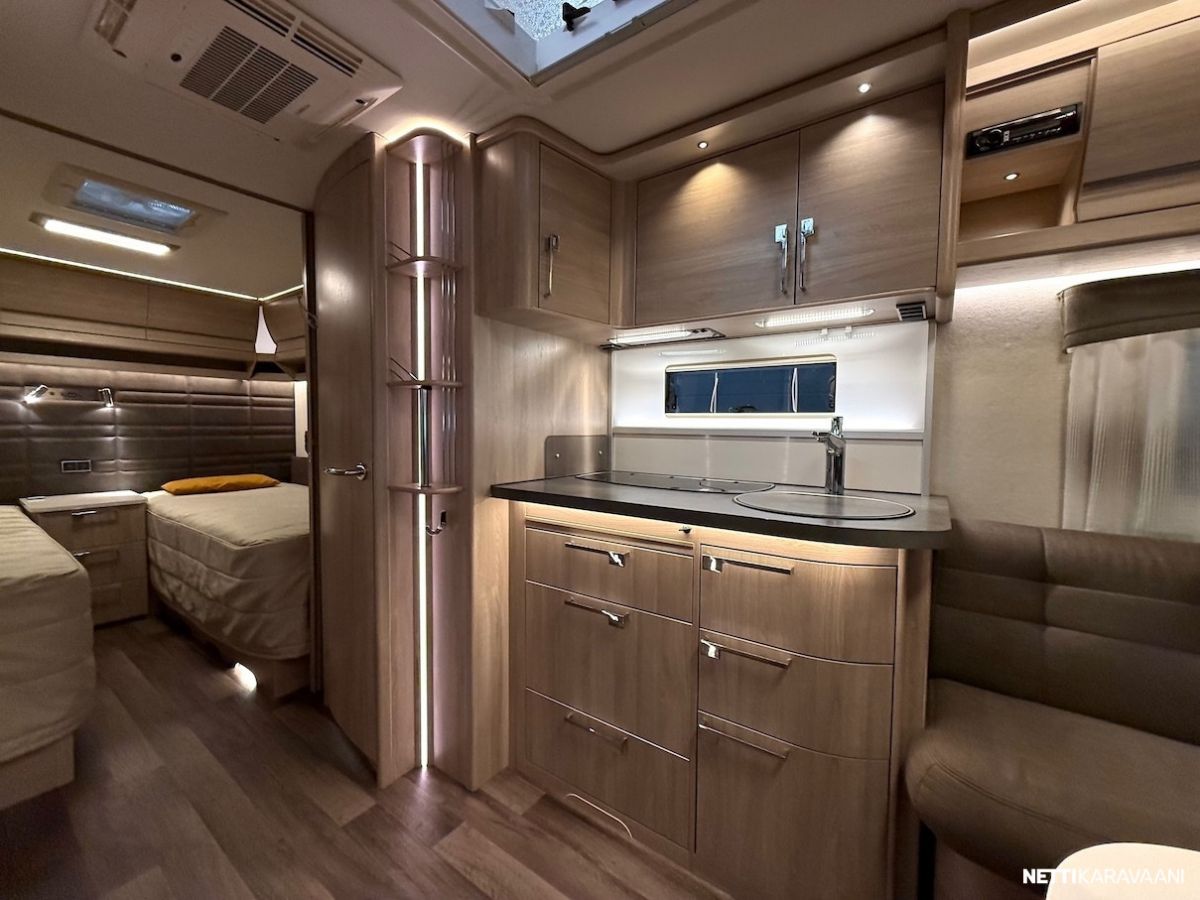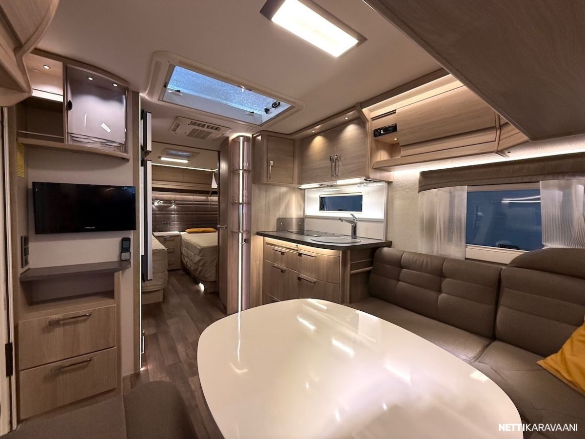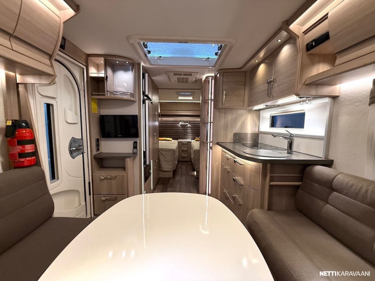 Alde 3020 -nestekeskuslämmitys kaasulla ja sähköllä, nestekiertoinen lattialämmitys, EcoPrim -foam eristys, kaikki vesijärjestelmät sisällä, sileä ulkopelti, hyttysverkko-ovi, kirkkaat Mini Heki -kattoluukut, CD-radio ja kaiuttimet, suksikotelo ulosvedettävällä kaukalolla, TV-teline, TV-antenni, LED-valaistus ja epäsuora tunnelmavalaistus, alumiinivanteet, kitkavetopää, liesituuletin, jousipatjat ja sijauspatjat, päiväpeitot, sähkökeskus 230 v ulosotolla ja kWh-mittarilla, Dometic -asuinosan ilmastointi - Mukavuuspaketti (sis. Suuri jääkaappi erillisellä pakastimella ja molemminpuolin avattavalla ovella, tavaraluukku sängyn alle, niskatyynyt istuinryhmässä, pyyhekuivain, sähköisesti ylösnostettava vuoteen pääty) - Design -paketti (sis. 15 tuuman alumiinivanteet, ikkunallinen ulko-ovi, suuri Heki 2 -kattoikkuna) - Mikrouuni jääkaapin alla. - Ekopaketti (sis. 130 Ah AMG Akku, akkusensori, Kabe Airvent -tuuletinkattoluukku omalla termostaatilla, aurinkopaneeli)