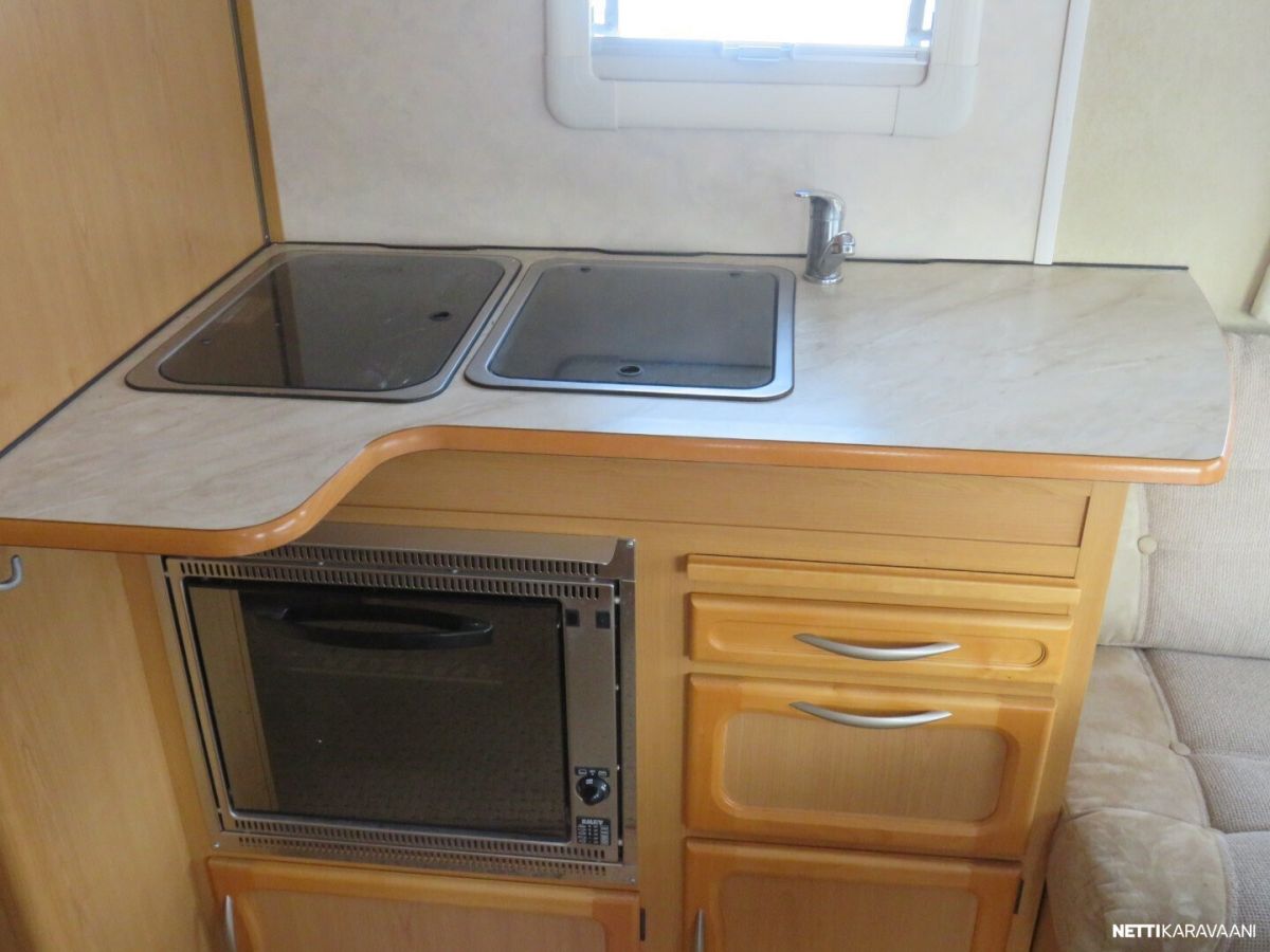 Jääkaappi, Kaasu-uuni, Kasetti WC, Kasettiverhot, Liesi, Lämminvesiboileri, Markiisi, Pakastelokero, Pesuallas, Suihku, TV-antenni tai lautasantenni, Alde, Kattoluukku, Lattialämmitys, Sähköpatruuna, Tukijalat