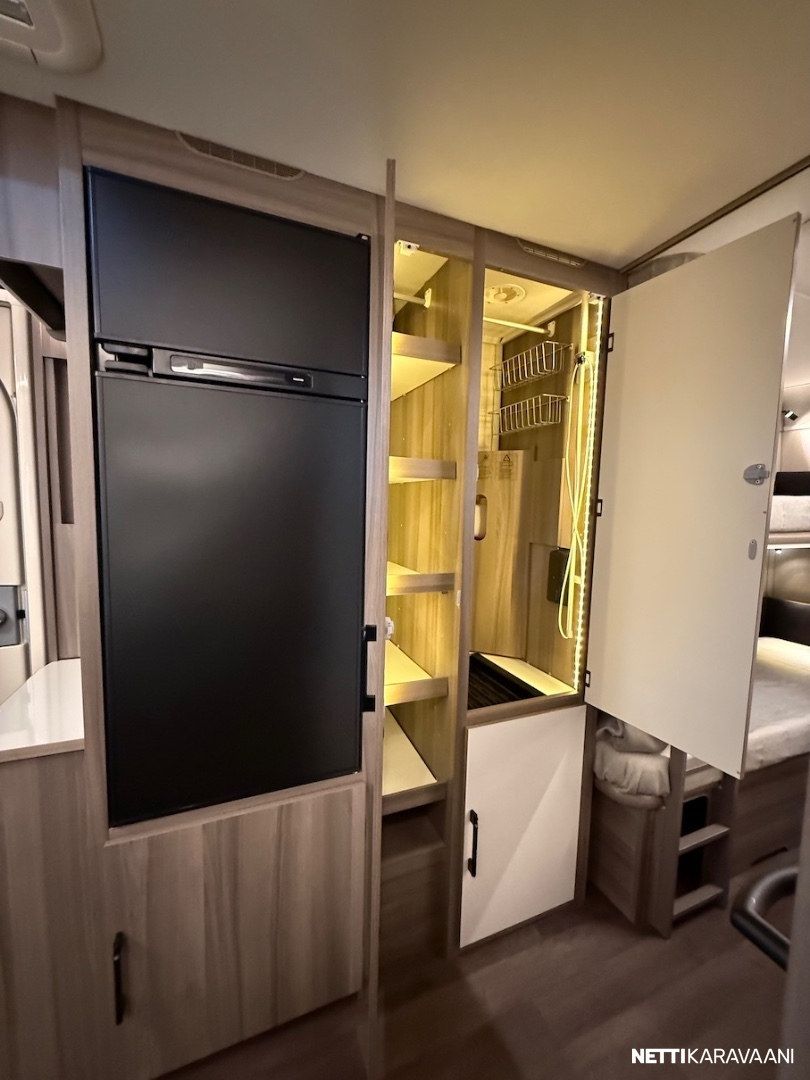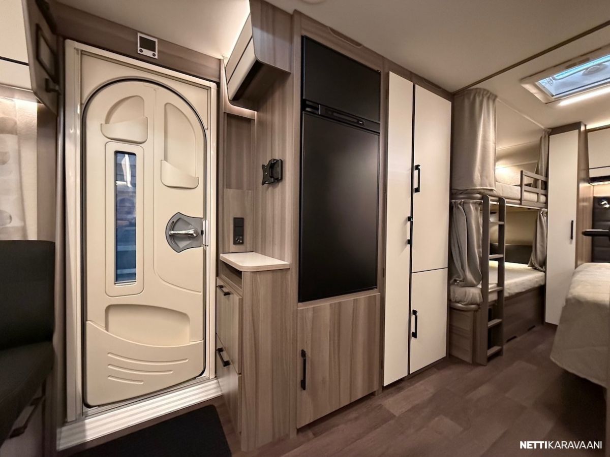 Jääkaappi, Kasetti WC, Kasettiverhot, Liesi, Lämminvesiboileri, Pakastelokero, Pesuallas, Suihku, TV-antenni tai lautasantenni, Alde, Aurinkopaneeli, Erikoisvanteet, Eristetty harmaavesisäiliö, Kattoluukku, Lattialämmitys, Sähköpatruuna, Tukijalat