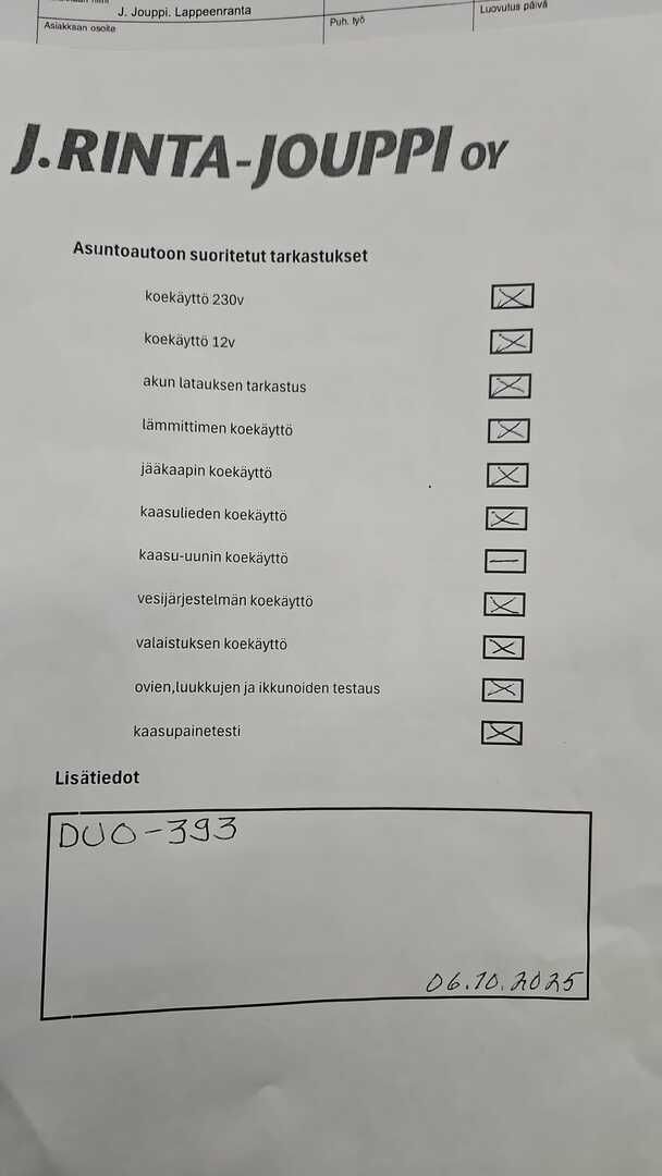 Katso kaikki kuvat, tarkemmat tiedot ja varaa omaksesi: https://www.rintajouppi.fi/auto/kabe/orion/DUO-393/ * 14 päivän palautusoikeus. Mielenrauhaa autokauppaan. Osta rauhassa, päätä varmuudella. Vain kuluttaja-asiakkaat. * J. Rinta-Joupilta vaihtoautoihin 3 kk lyhennysvapaa. Osta nyt, maksa myöhemmin! TÄMÄ VAUNU ON LAATUTARKASTETTU (kaasulaitteiden koeponnistukset/tiiveystarkastettu/laitetestaukset) Uusi aisapyörä Edessä kaasupullo-/välinekaappi Edessä vastakkain istuttavat sohvat / pöytäryhmä Kaasuliesi Pesuallas Electrolux jääkaappi pakastelokerolla Lattiamatot Hyttysverho ovessa ALDE-Nestekeskuslämmitys Kasetti WC Tukijalat Kattoluukut Makuupaikat 2-4:lle Pituus n. 695cm Leveys n. 220cm Omamassa 1000kg Kokonaismassa 1230kg Tuontivaunu, tuontimaa Ruotsi (2025) * Tutustu asuntovaunuvalikoimaamme osoitteesta https://www.rintajouppi.fi/matkailuvaunut/ tai koko caravan-valikoimaamme https://www.rintajouppi.fi/matkailuautot-ja-vaunut/ * Tämä ja kaikki tuhansista vaihtoautoistamme ovat ostettavissa mistä tahansa päin Suomea - kaikista J. Rinta-Joupin toimipisteistä.