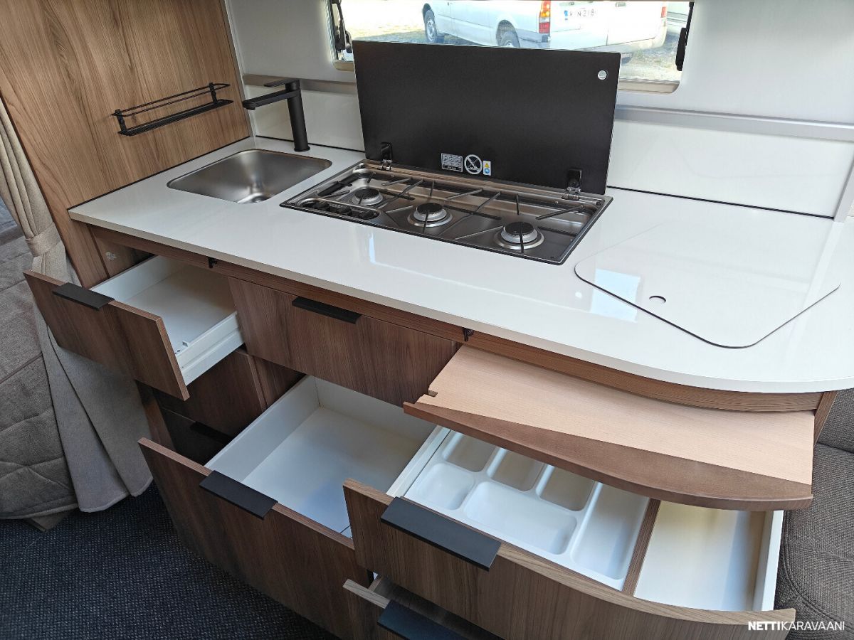 Smaragd esiteltiin jo vuonna 1967 ja on siitä lähtien ollut yksi arvostetuimmista malleistamme. Hyvin suunniteltu pohjaratkaisu tarjoaa tilaa ja mukavuutta – vuodesta toiseen. Yksiakselinen rakenne takaa hyvän hallittavuuden ja ketteryyden tiellä. Vaunun perushinta ilman lisävarusteita 50100,00€. Lisävarusteet: - Mukavuuspaketti + 1441,00€ (Pyyhekuivain, Sähkötoiminen päänalunen, Niskatyynyt, Tavaraluukku) - Heki 2 kattoikkuna + 384,00€ - Mikrouuni + 650,00€ - Duo Control vaihtaja + 487,00€ Kokonaishinta lisävarusteilla 53062,00€ Korileveys 230cm. Smaragd lanserades redan 1967 och har sedan dess varit en av våra mest uppskattade modeller. Med sin välplanerade grundlayout erbjuder den både generös rymd och komfort – år efter år. Den enkelaxlade konstruktionen ger dig kontroll och rörlighet på vägen. Grundpris 50100,00€ Tillval: - Komfortpaket + 1441,00€ (Handdukstork, Uppfällbar huvudgärde el, Nackstöd, Lastlucka) - Heki 2 + 384,00€ - Mikro-ugn + 650,00€ - Duo control gasol växlare + 487,00€ Totalpris med tillval 53062,00€ Karossbredd 230cm.