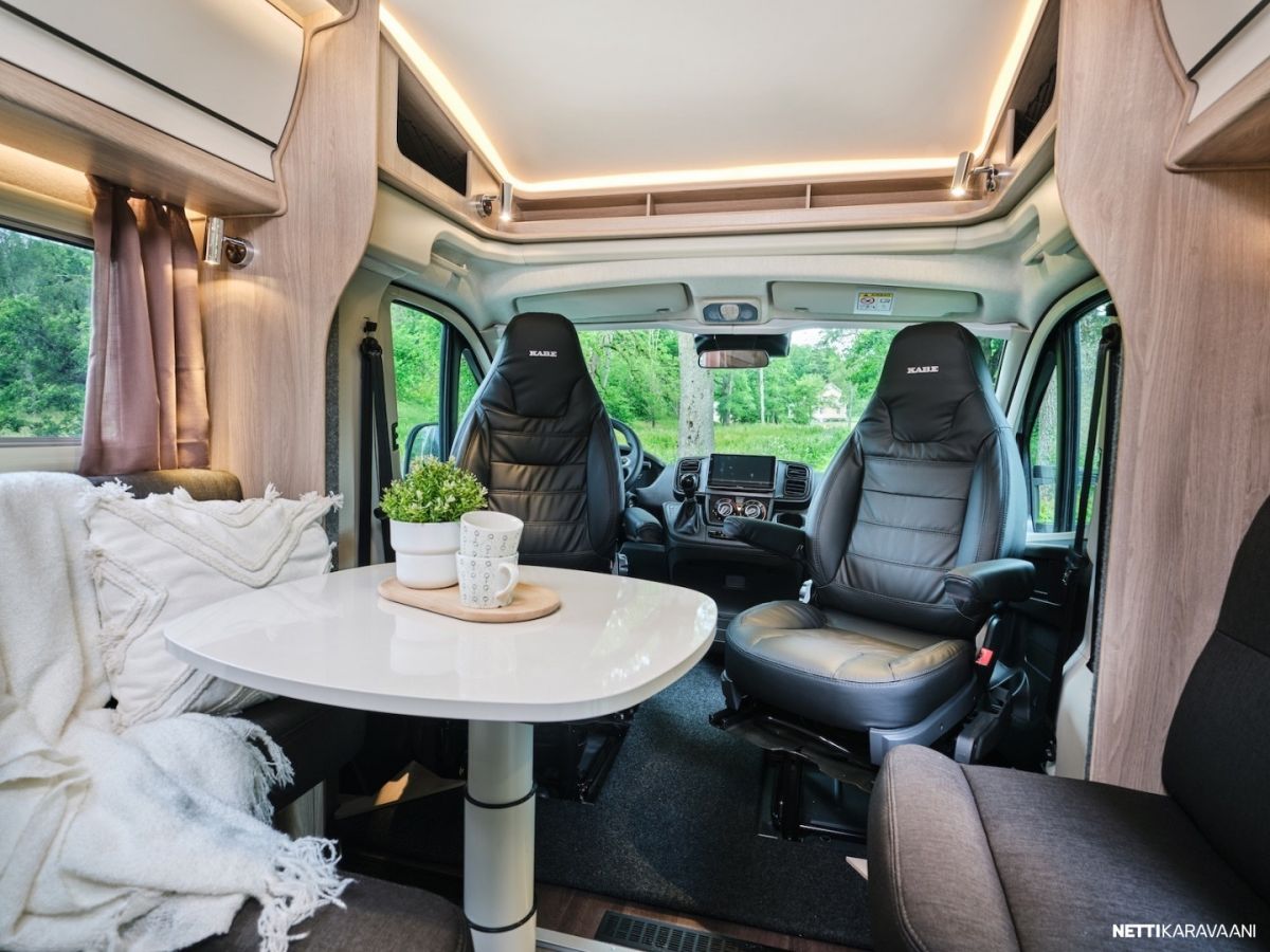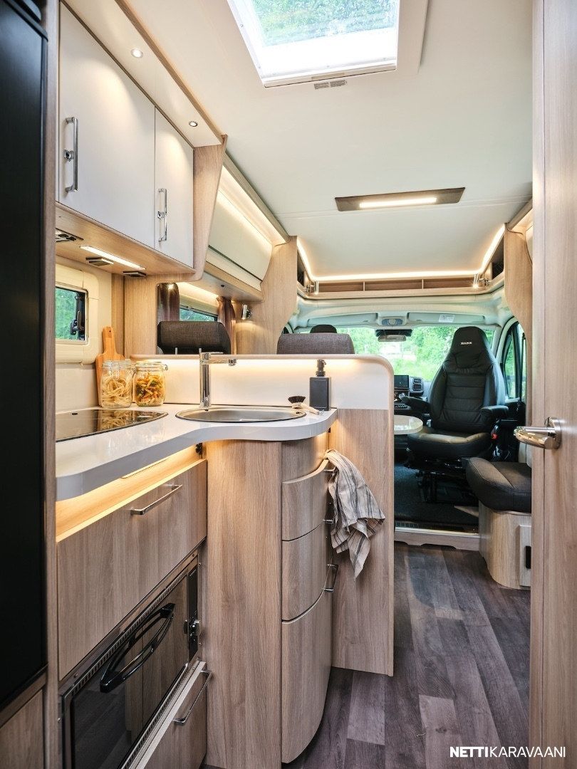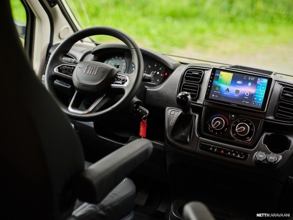 Harmaa ohjaamon erikoisväri, Full LED -ajovalot, Fiat -ohjaamon ilmastointi, adaptiivinen vakionopeudensäädin, väsymysvaroitin, ajovalojen avustaja, liikennemerkkien tunnistus, sade- ja hämäräavustin, kaistavahti, älykäs nopeusavustin ja automaattinen hätäjarrutus, ohjaamon Skyview -kattoikkuna, alumiinivanteet, ohjaamon Remis -kaihdinverhot, 2 x Airbag, sähkölasit ja -peilit, ohjaamon astinlaudat, Alde -nestekeskuslämmitys, nestekiertoinen lattialämmitys, nestekiertolämmitteinen ohjaamon matto, Alde -lämmönvaihdin asuinosan ja moottorin välille, kaikki vesijärjestelmät sisällä lämpimässä, ikkunallinen ulko-ovi keskuslukituksella, hyttysverkko-ovi, suuri jääkaappi erillisellä pakastimella, Pioneer -multimediasoitin peruutuskameralla, Apple CarPlay ja AndroidAuto, nahkainen monitoimiratti, liesituuletin, TV-antenni ja kaapista alaslaskettava TV-teline, LED-valaistus ja epäsuora tunnelmavalaistus, uretaanikarmi-ikkunat, Ecoprim Foam -eristys, Thule Omnivent 12 v. tuuletinkattoluukku, L-istuinryhmä ja pöytä pilarijalalla, läpi auton tavaratila.