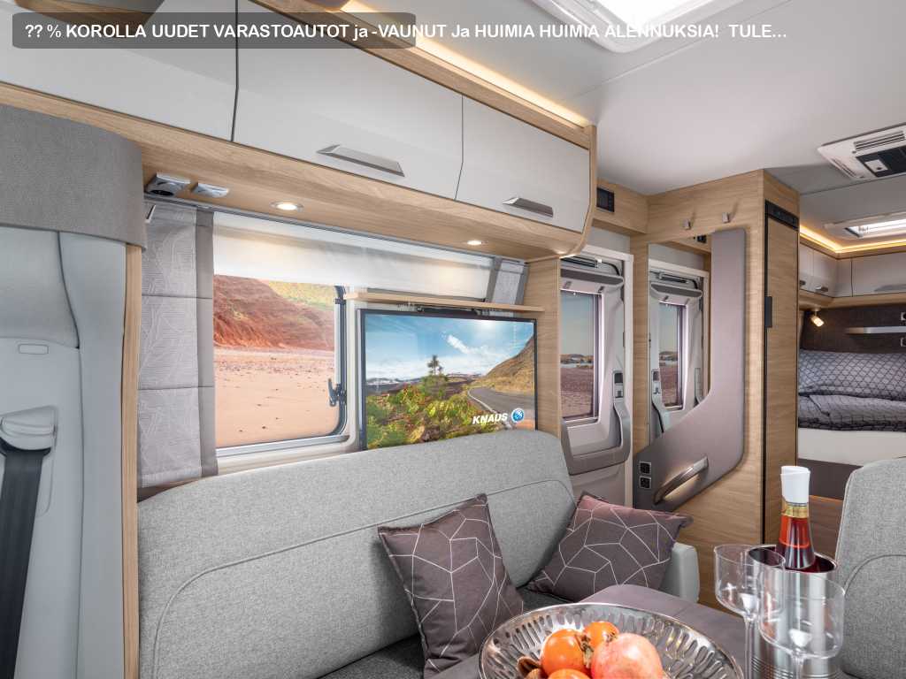 LISÄALE 13000€, AUTO ON UUSI, KÄYTTÄMÄTÖN, REKISTERÖITY ELOKUU 2025!, (VM 2024) !, , UPEA TARJOUSMALLI, NELIVETO!, Edessä puolidinetti kääntyvillä ohjaamon istuimilla, ja tilavat pitkittäissohvat, joiden takaosassa tehtävissä istuinpaikat 3-pistevöin, keskellä L-keittiö, takana parivuode pitkittäin, ja kylpyhuone, Alde Nestelämmitys, takana LISÄilmajouset kompressorilla, säätö kojelaudassa, läpi auton tavaratila, luukku myös kuljettajan puolella, ulosvedettävä kaasupullokotelo... , Hinta & paino vakiovarustein 3.308 kg 107.140 €(sis. ALV 25, 5%), , Tässä autossa seuraavat lisävarusteet: , 232769 Kokonaispainon nosto 3.500 kg*** - 4.000 kg*** 391 € , 552686 2 lisäistuinta 3-pistevyöllä, istuma-asento matkustussuuntaan (1kpl , kuljettajan puolella, 1 kpl apukuljettajan puolella) +50 kg 2.970 € , Multimedia / Kuljetus , 200394 Takatukijalat +4 kg 425 € , 102515 THULE Lift V16, manuaali - Polkupyöräteline kolmelle pyörälle, korkeussäädettävä, , max 50 kg +18 kg 906 € , Merkintä: , Huomioithan, että polkupyörätelineen kiinnittäminen takaseinään saattaa rajoittaa , peruutuskameran näkökenttää. , Ovet , 102576 , Asuinosan ovi KNAUS EXKLUSIVE: ikkunaan integroitu Coming-Home- , valo, monipistelukitus, , piilosaranat, aukaisurajoitin kaasujousella, , kaksinkertainen tiiviste, nahkaverhoillut yksityiskohdat, sähköinen , keskuslukitus, integroitu sateenvarjoteline, monikäyttötasku , +2 kg 254 € , Ikkunat / Kattoluukut / Ilmanvaihto , 101820 Upotettu ikkuna SEITZ S7 1.002 € , 102685 Panoraamakattoikkuna istuinryhmän yläpuolella 130 x 45 cm Midi , Hekin sijasta (edessä) +12 kg 388 € , Asuminen / Makuutilat / Sisusta / Tekstiilit , 552327 Tallelokero +6 kg 548 € , 552574 Kiinteä vuode laadukkaalla patjalla (EvoPore HRC + WaterGEL) (vain , kiinteät vuoteet) +6 kg 513 €, 552369 Muotoonommellut aluslakanat 2:lle vuoteelle (Kiinteisiin vuoteisiin, , riippuen pohjaratkaisusta) +1 kg 92 € , 550660-05 Paketti MAGNOLIA +3 kg 238 € , 201074 Ohjaamon mattosarja, KNAUS Design +2 kg 101 €, 550235 Asuinosan mattosarja +6 kg 493 € , Kaasu / Lämmitys / Ilmastointi , 301057 Etänäyttö + TRUMA Eis ex lämmitysvastus DuoControlliin 205 € , 301957 Duo Control CS -automaattinen pullonvaihtaja, sis.kaasusuodattimen +1 kg 534 € , 302494 Kaasuvaroitin 150 € , 300518 Kaasun ulosotto +1 kg 279 € , 550566-01 ALDE -nestekiertolämmitys +41 kg 3.407 € , Merkintä: , Riippuen pohjaratkaisusta, tehostimia/Boosteri nestekennolla: on yksi tai enemmän lämmityksen tehostamiseksi , 352966 ALDE Lämmittimen LCD paneeli , 552052 Asuinosan ilmastointi DOMETIC Freshjet 2200 +29 kg, NYT 0€ (2.916 €) , Merkintä: , Mikäli tämä varuste on valittuna, ajoneuvon korkeus kasvaa n. 11cm , Markiisi / Markiisin lisävarusteet , 501333-01 Markiisi 405 x 250 cm, antrasiitti +31 kg 1.366 € , 224061 Rengaspaineen tunnistusjärjestelmä + 477 € , Hinta & paino vakiovarustein 3.308 kg 107.140 €(sis. ALV 25, 5%) , Lisävarusteiden hinta & paino 188 kg 17.655 € , Kokonaishinta & paino 3.496 kg 124.795 € minus Juken LISÄ-ALE 13000€= = OUTLETHINTA 111879€ +tk. 1150€, = Vaatii C-1 Kortin, aj. 162km , sis. ALV 25, 5%. , (VW Luovutushuolto-tarkistus 3.4. Saksa) ja Vaihdot! REKISTERÖITY ELOKUU 2025!, (VM 2024), Ilmastointi (Manuaalinen), Ilmastointi (Automaattinen), Jääkaappi, Kasetti WC, Kasettiverhot, Lattiamatot asunto-osassa, Liesi, Lämminvesiboileri, Markiisi, Pakastelokero, Parivuode, Parkkitutka / kamera, Pesuallas, Sisätilanpistoke, Stereot, Suihku, ABS-jarrut, Ajonvakautusjärjestelmä, Head-Up-näyttö, Kaistavahti, Kevytmetallivanteet, Panoraamakatto, Rengaspainevalvontajärjestelmä, Start-stop järjestelmä, Alde, Erikoisvanteet, Eristetty harmaavesisäiliö, Huoltokirja, Kattoluukku, Lattialämmitys, Nestekiertolämmitys, Pyöräteline, Ilmajouset, Sähköpatruuna, Sähkörappu, Tukijalat