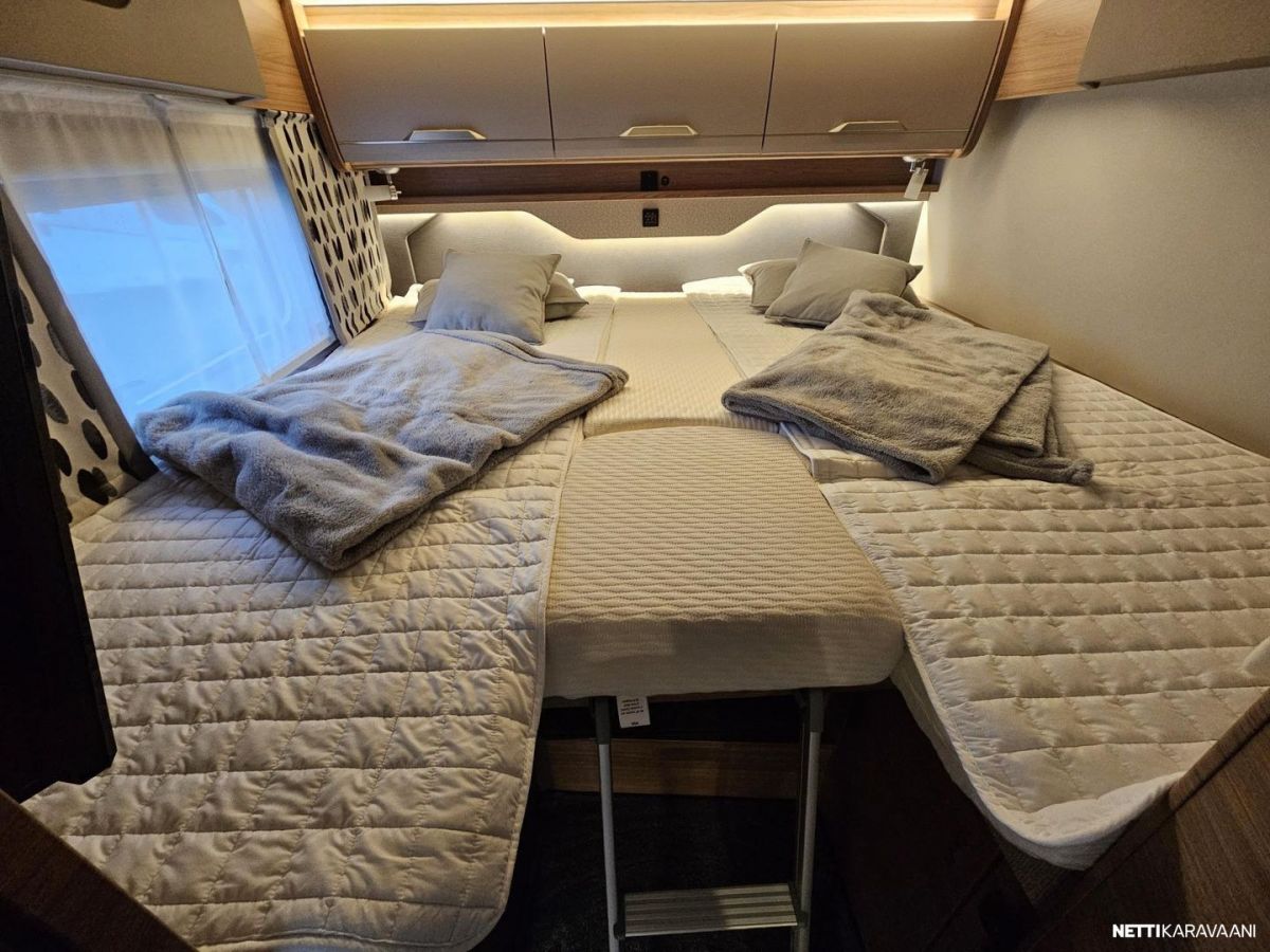 Laadukas saksalainen Knaus neljällä makuupaikalla. Takana yhdistettävät erillisvuoteet, edessä kätevä nostovuode kahdelle. Keskellä keittiö ja WC/suihku.