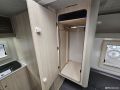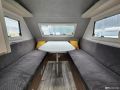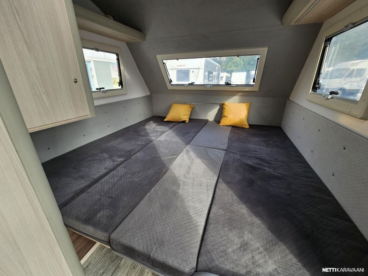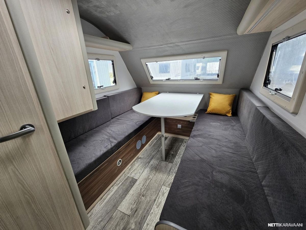 Suosittu katsastusvapaa Kulkuri-vaunu. Edessä pöytäryhmä, jossa yhdistettävät erillisvuoteet. Takana keittiö ja WC/suihku.