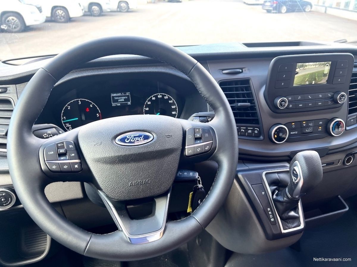 Automaattivaihteisto, Obsidian -musta metalliväri, vakionopeudensäädin, nahkainen ohjauspyörä, Ford -ohjaamon manuaali-ilmastointi, LED-päiväajovalot, 16 tuuman alumiinivanteet, 2 x Airbag, ohjaamon kaihdinverhot, Ford Audio -soitin ja peruutuskamera, pysäköintiavustin edessä ja takana, etusumuvalot, takaikkunan lämmitys, takaovissa LED-Downlight valaistus, TV-valmius, lisäpehmuste varavuoteeseen, eristetty ja lämmitetty jätevesisäiliö, USB-latausrasia, MidiHeki -kattoikkuna, markiisi, suihkun puinen lattiaritilä, suihkuvarustus, pesutilan ikkuna, vaatetanko pesutilassa, hyttysverkko-ovi.