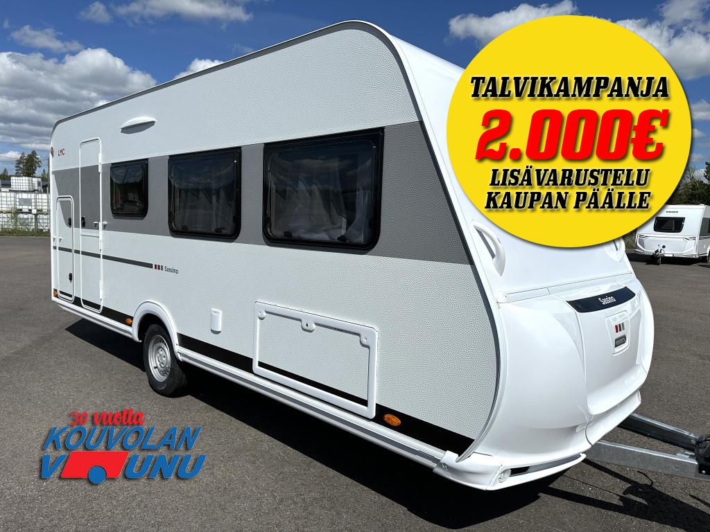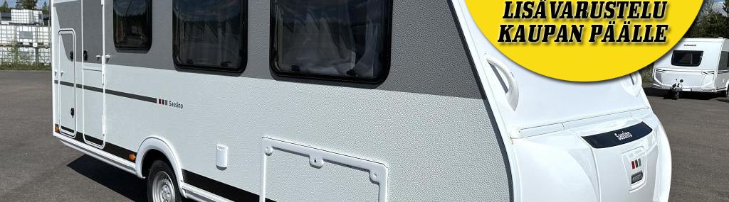 TALVITARJOUS! TÄHÄN VAUNUUN 2.000E LISÄVARUSTELU KAUPAN PÄÄLLE. TARJOUS VOIMASSA 27.03.2026 ASTI, Ulkoisesti ja sisustaltaan uudistunut Sassino kevyenä ja mukautuvana lapsiperhemallina aktiiviselle liikkujalle. Tyylikäs skandinaavinen harmaa sisustus puunvärisillä kalusteilla ja mustilla yksityiskohdilla huokuu arvokkuutta. Vaunun pohjalevy lasikuitua eli ei happanevaa pohjavaneria! Vuodepaikat jopa kuudelle hengelle. Vuoteet takana 200/195 x 83cm, Vuode edessä 192 x 92cm Perusvaunu: 26.200eur, Autarkie-paketti 1.150eur (sis. 12 V kiertoilma-automatiikka - Akku 95 Ah AGM - Laturi - Akkujen jännityksen näyttö - 12 V pääkytkin), Sassino-paketti 2.630eur (sis. Harmaavesisäiliö 25L pyörillä - Vararengasteline kaasupullokotelossa - Hyttysverkko-ovi - Lisävalaistus valokisko sis. spottivalot - Katon vahvistus ilmastointilaitteelle - 2x USB-pistoke virtakiskossa - Nokkapyörä ja aisapainon näyttö - Tuorevesisäiliö 44 l ulkopuolisella täyttötuella - , Talla takatukijalkoihin)