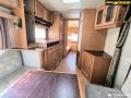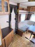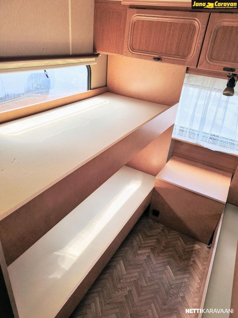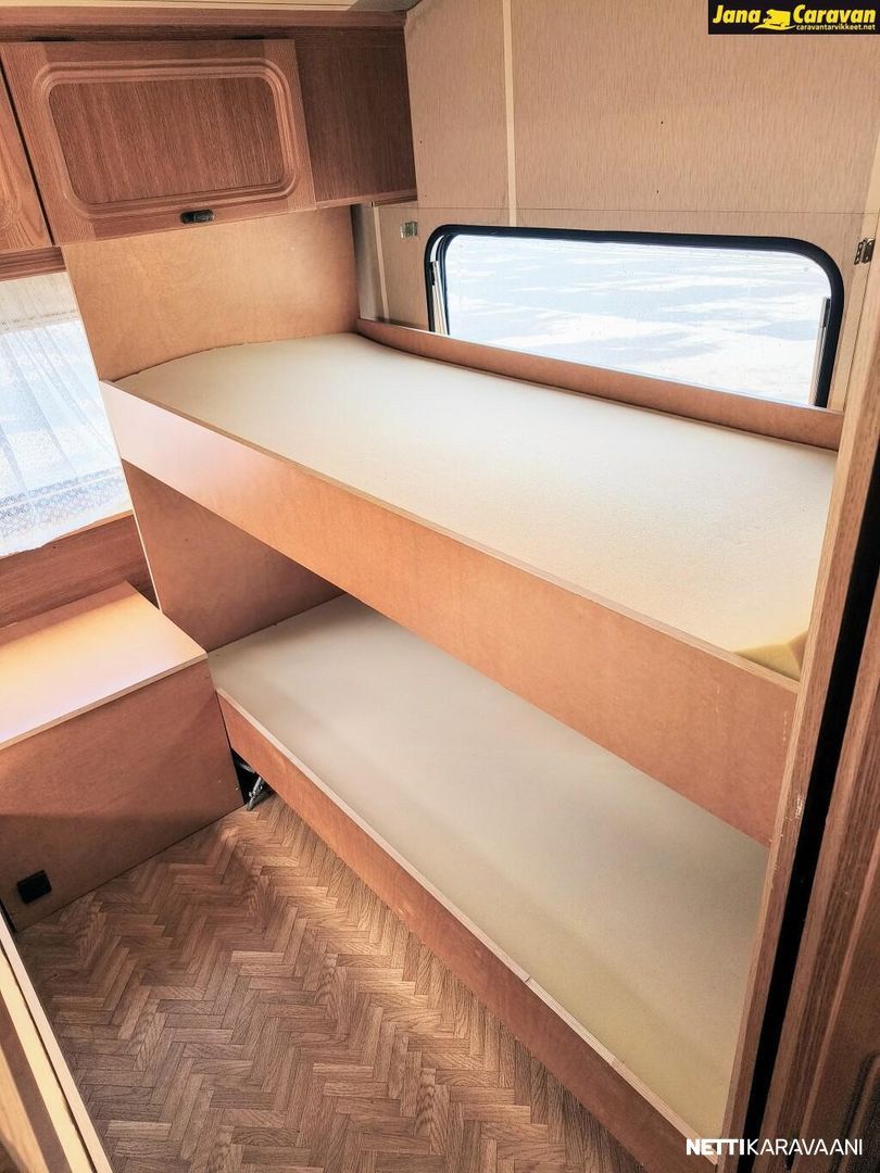 Keulassa kerrossängyt molemmin puolin vaunua, sänkyjen koko 162cm x 63cm.