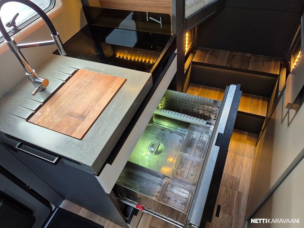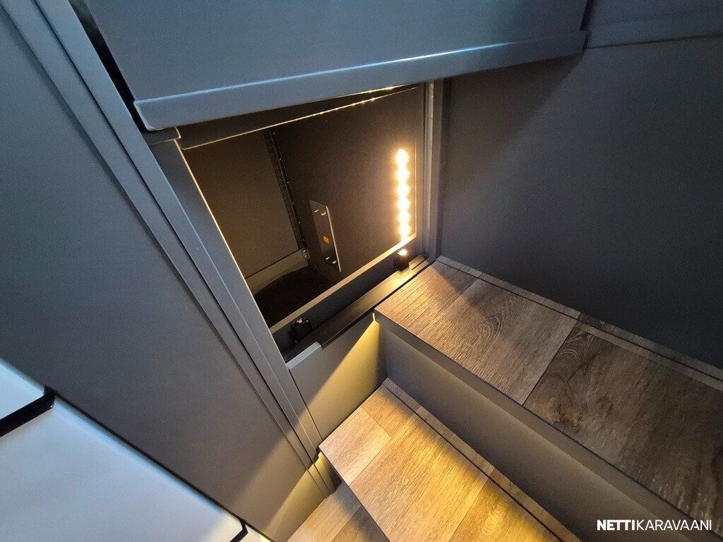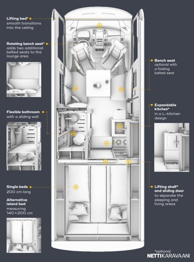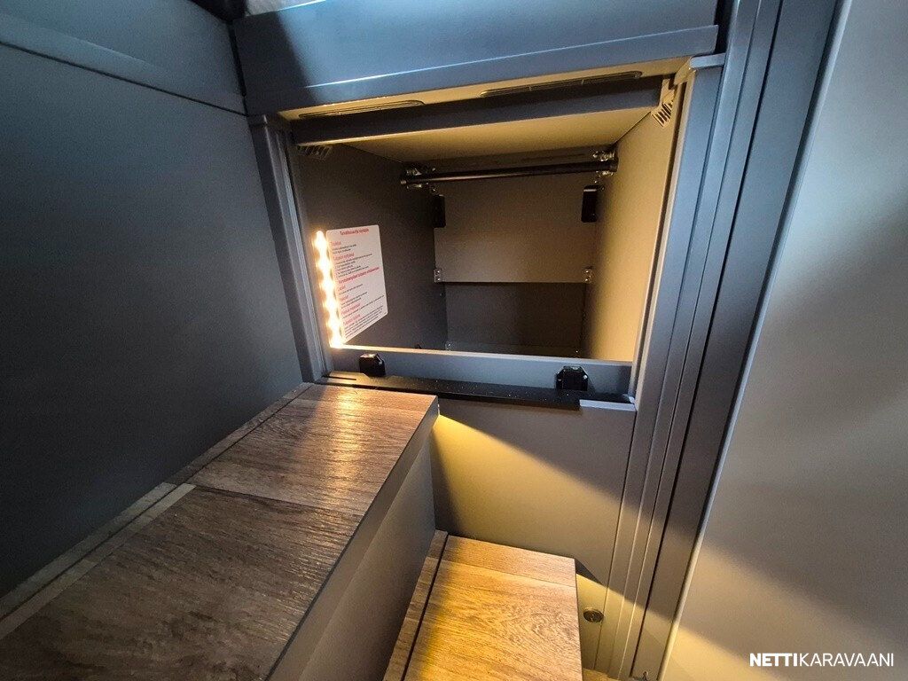 Ajotietokone, Jääkaappi, Kasetti WC, Kasettiverhot, Keskuslukitus: Kaukosäätöinen, Liesi, Lämminvesiboileri, Markiisi, Navigaattori, Ohjaustehostin, Pesuallas, Pysäköintikamera, Sisätilanpistoke, Suihku, Sähköpeilit, TV-antenni tai lautasantenni, Vakionopeudensäädin, ABS-jarrut, Airbag, Käynnistyksenesto, Sumuvalot, Alde, Erikoisvanteet, Kattoluukku, Sähköpatruuna, Sähkörappu, Turbo
