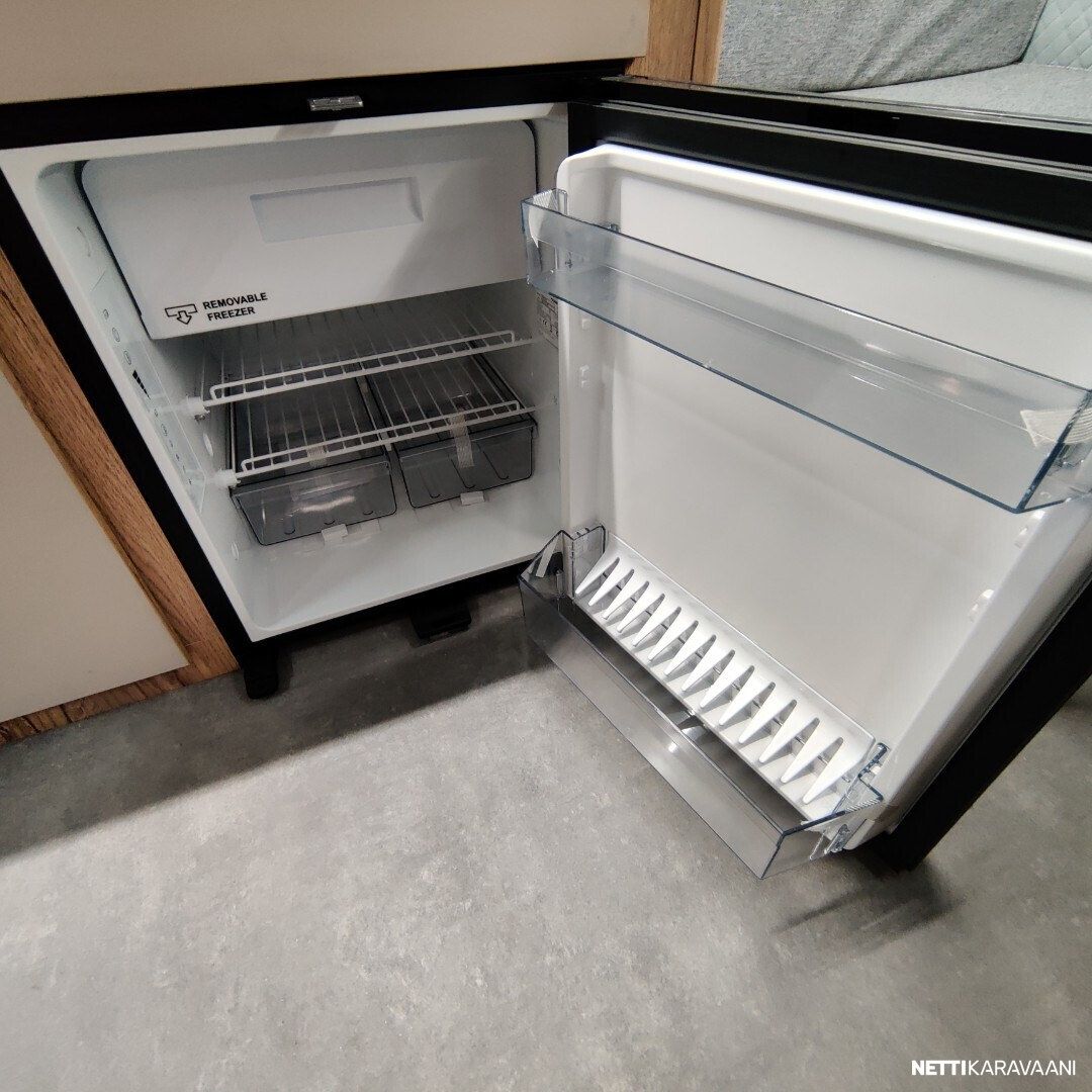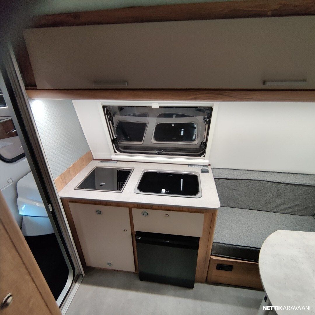 Jääkaappi, Liesi, Pesuallas, Sisätilanpistoke, Takakeittiö, Kattoluukku, Lattialämmitys, Trumatic, Tukijalat