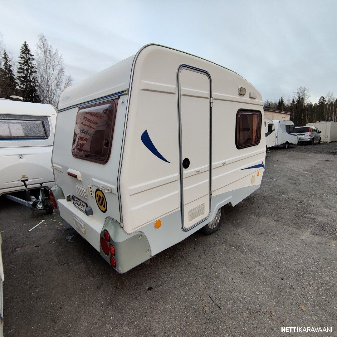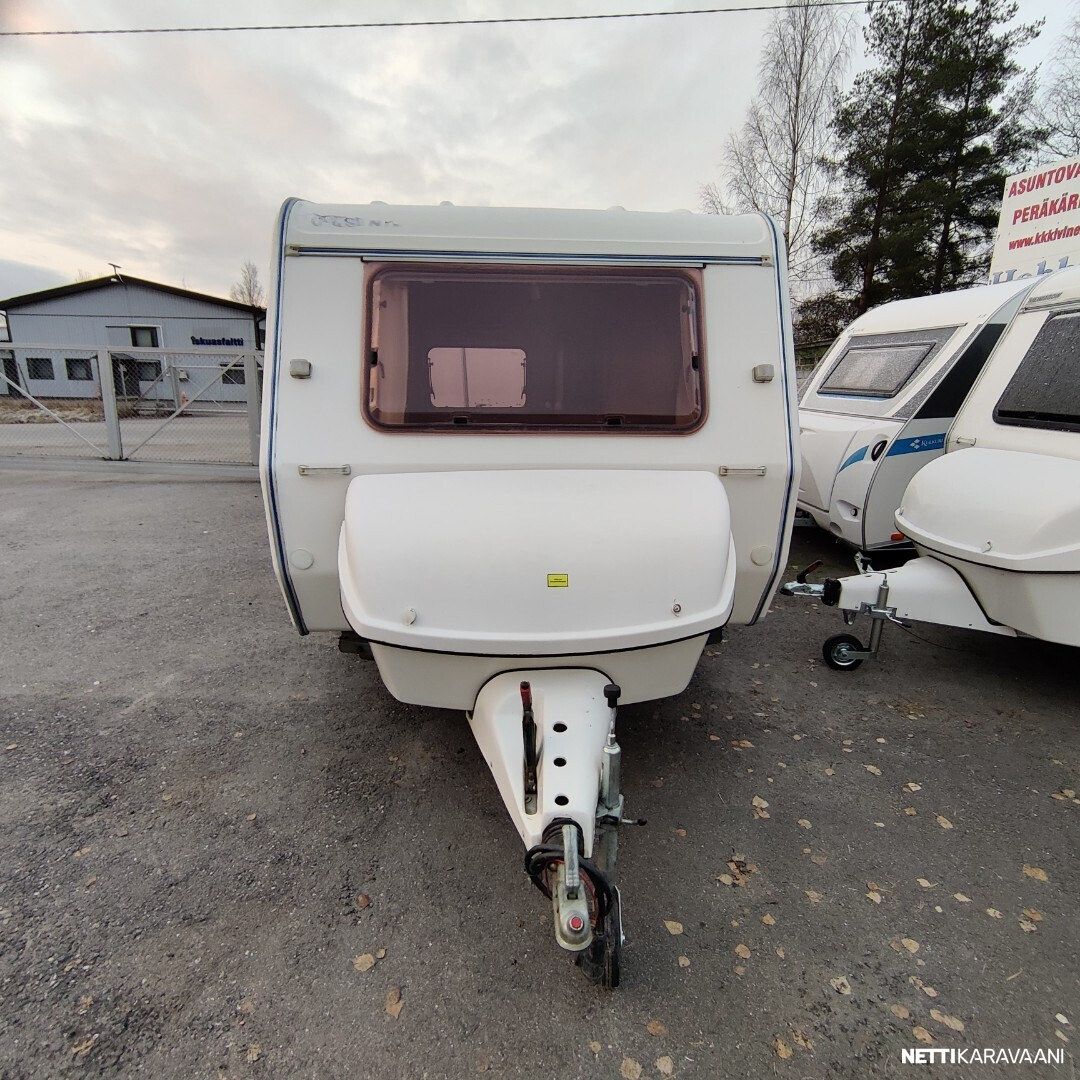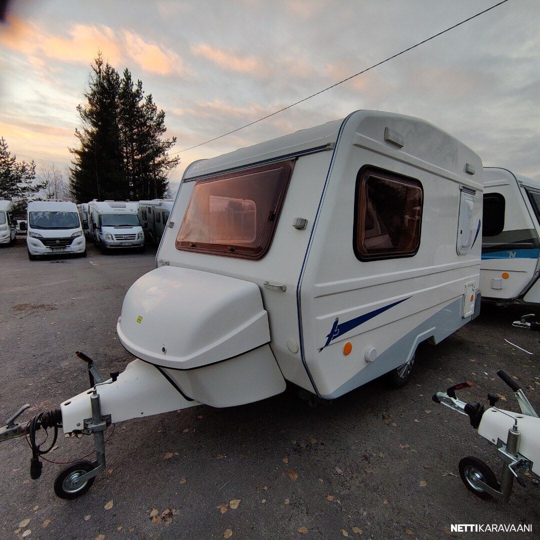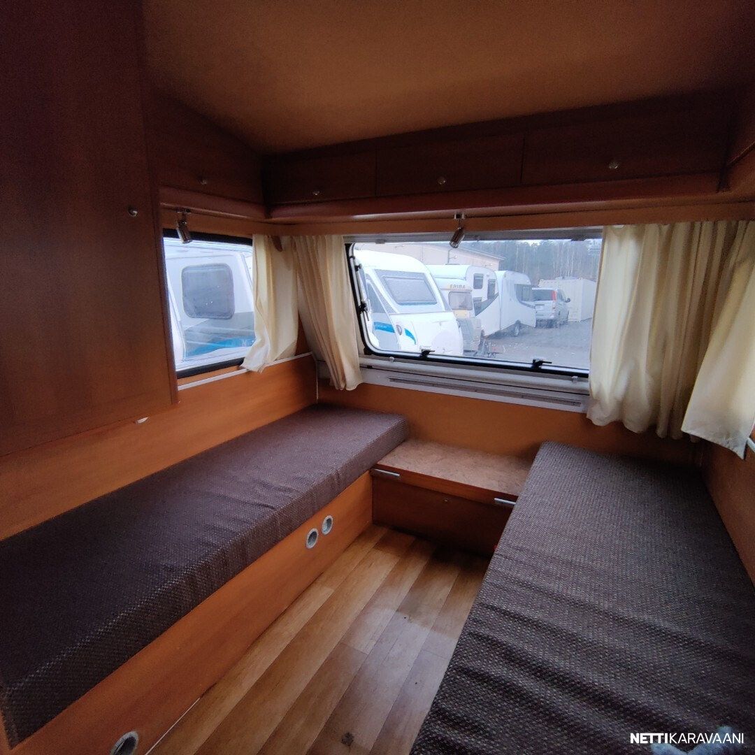 Siisti vaunu Vain yksi omistaja uudesta saakka ! Meidän uutenakin myymä yksilö! Vaunussa voi nukkua erillisvuoteissa tai pöydän laskemalla isossa parivuoteessa Pöytä on mukana Kasetti WC Akku ja laturi TV antenni Katsastus vapaa! Saa ajaa 100 kmh Jarrut ja turvallinen vetää myös pienellä autolla