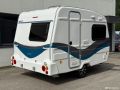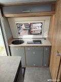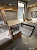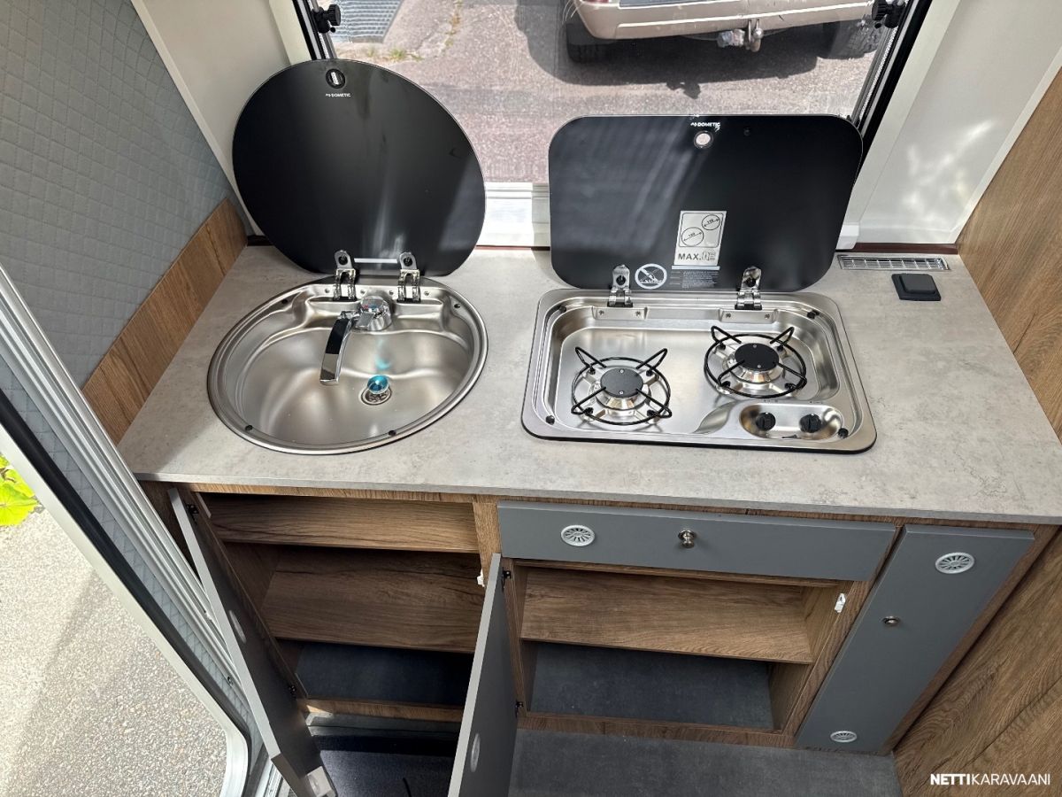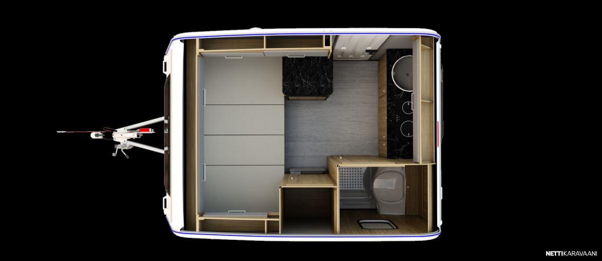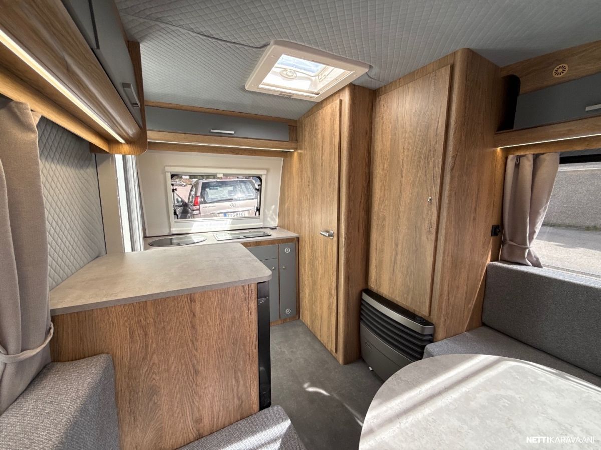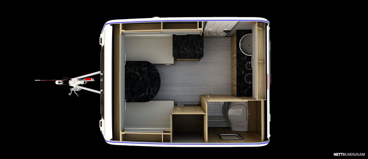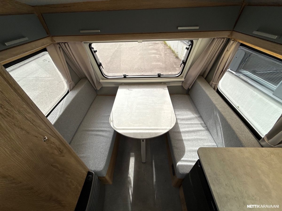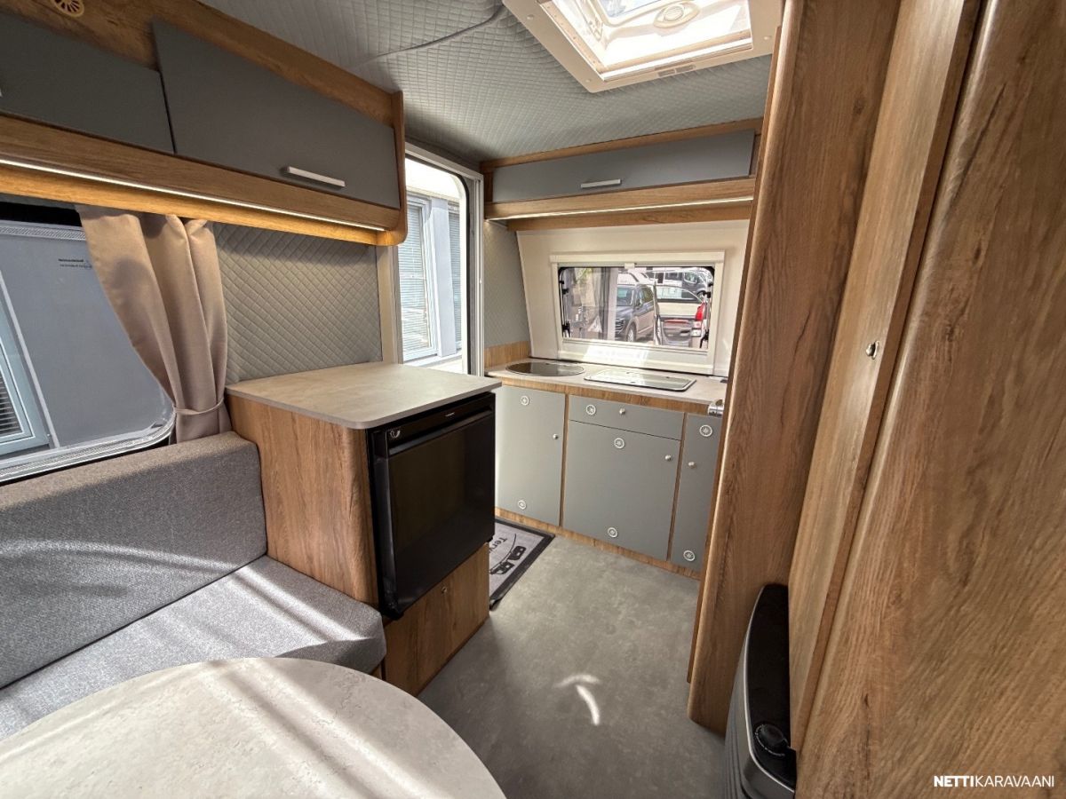 Suosittu ja perinteinen Poksi 126 NT-pohjaratkaisulla, jossa tilava keittiö, työtaso jääkaapin päällä sekä sohvaryhmä, josta levitettävissä parivuode.