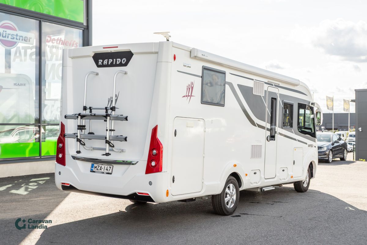 Huipputyylikäs saarekevuoteellinen integroitu Rapido miellyttävällä ja tehokkaalla Mercedeksen alustalla. Erikoisvanteet Markiisi Pyöräteline Tukijalat Hyttysverkko ovi Kasettiverhot Peruutuskamera Multimediakeskus Navigointijärjestelmä Automaattivaihteisto Ilmastointi ajotilassa Luistonestojärjestelmä Lukkiutumattomat jarrut (ABS) Monitoimiohjauspyörä Nahkasisusta Sähkökäyttöiset ikkunat Sähköpeilit Adaptiivinen vakionopeudensäädin Kattoluukku Aurinkopaneeli Invertteri Iso kattoikkuna Iso pöytäryhmä Keskuslämmitys Truma Sähköpatruuna Lämminvesiboileri Pullonvaihtaja Sähkörappu Liesituuletin Iso-jääkaappi Pakastelokero Liesi Saarekevuode Hubbet ylävuode Kasetti WC Pesuallas Erillinen suihku Ulkosuihku Tuplapohja Takatalli TV-antenni tai lautasantenni Meiltä voit ostaa etänä vaikka kotisohvaltasi! Kokeile kuinka helppoa ja vaivatonta matkailuajoneuvon ostaminen on.