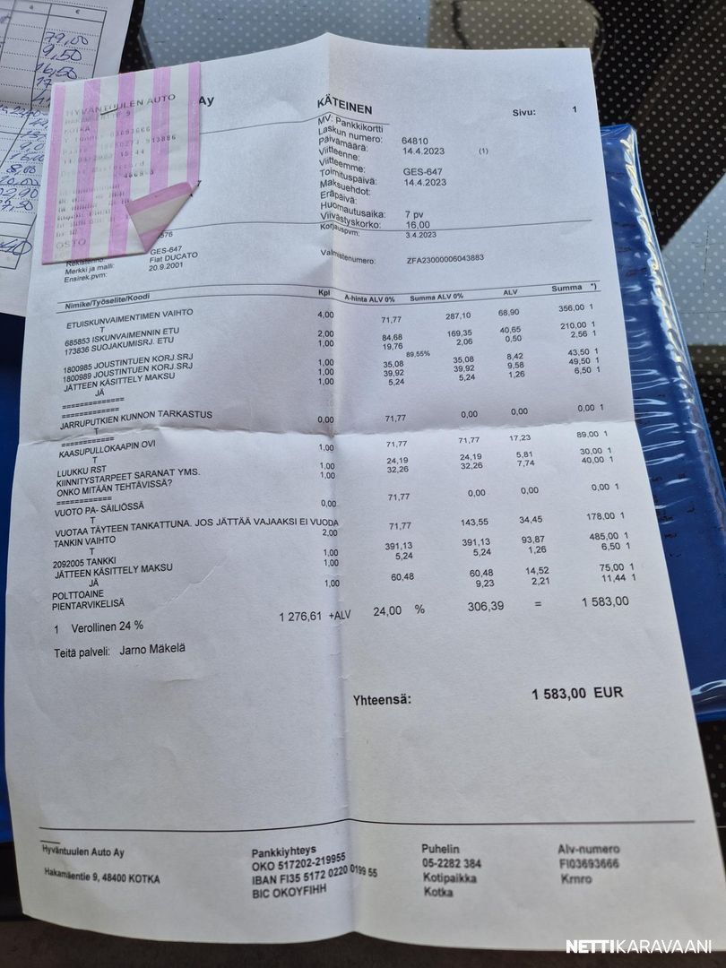 Vaihteisto: Manuaali Polttoaine: Diesel Vetotapa: Etuveto Leveys: 224 cm Pituus: 596 cm Rekisteröity: 01.09.2001 Katsastettu: 01.06.2025 Matkustajat: 6 Oma massa: 2 935 kg Ajokortti: Ei määritelty Lämmitys: Ilmakeskuslämmitys