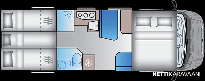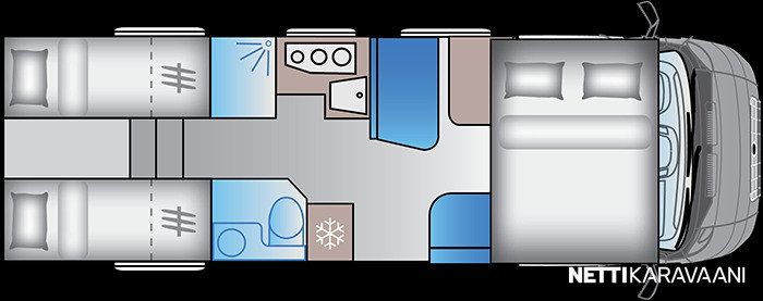 Vaihteisto: Automaatti Polttoaine: Diesel Vetotapa: Etuveto Leveys: 230 cm Pituus: 743 cm Matkustajat: 4 Kokonaismassa: 3 500 kg Oma massa: 3 195 kg Makuupaikat: 4 Ajokortti: B Lämmitys: Ei määritelty