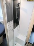 Vieressä eteenpäin toisella puolella käytävää suihkutila ja toisella puolella wc.