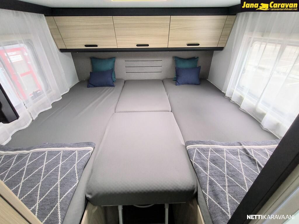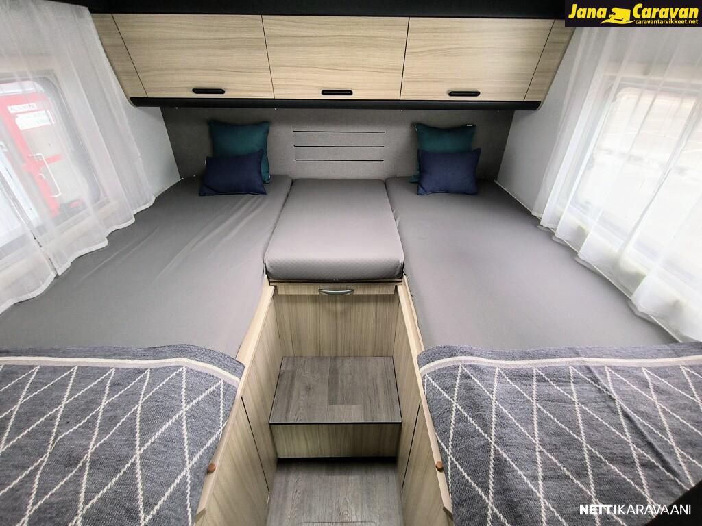 Takana erillisvuoteet, jotka yhdistettävissä parivuoteeksi. Vuoteen alla todella iso takatalli, jonne ulkoluukut molemmilla puolilla autoa.