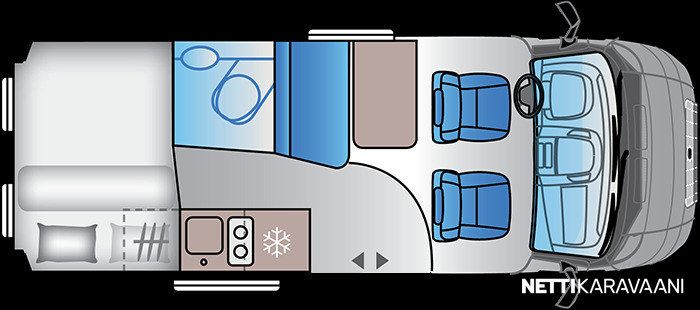 Vaihteisto: Automaatti Polttoaine: Diesel Vetotapa: Etuveto Leveys: 205 cm Pituus: 541 cm Matkustajat: 4 Kokonaismassa: 3 500 kg Makuupaikat: 4 Ajokortti: B Lämmitys: Ilmakeskuslämmitys