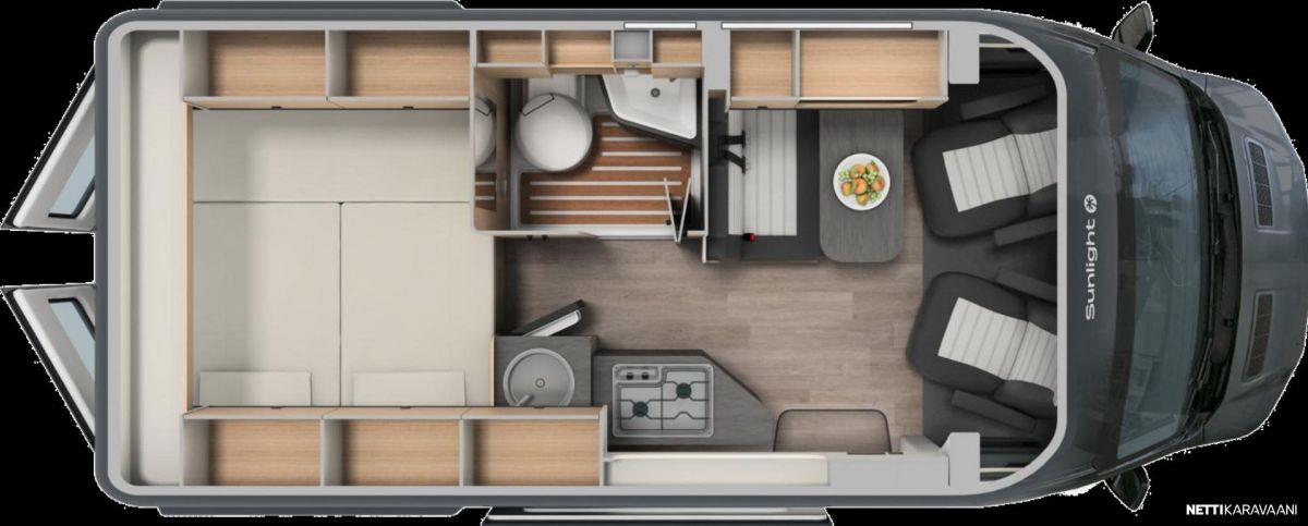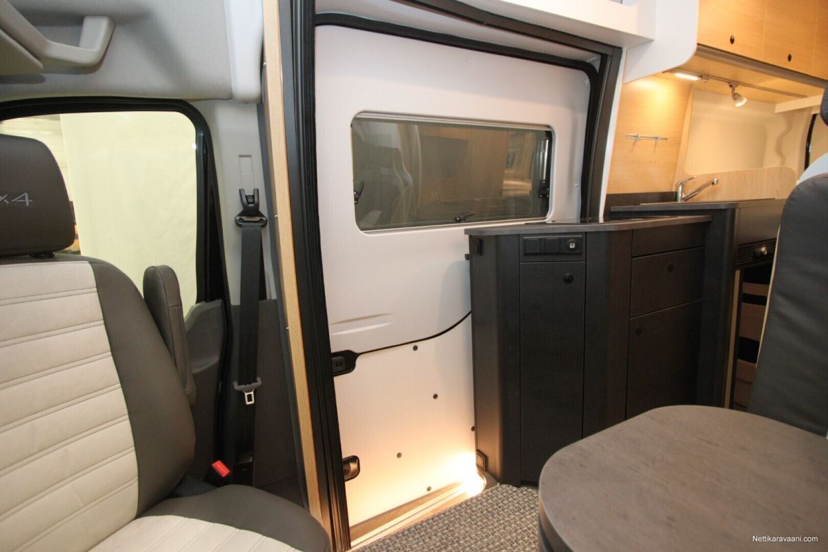 -Adventure paketti joka sisältää: Iso kattoikkuna 50*70, Suihkuvarustus, Ikkuna vessassa, Vaatetanko suihkussa, Leveä oven askelma, Pöydän jatke, Ohjaamon ilmastointi, Maalattu etupuskuri, Sumuvalot, KAarrevalot.