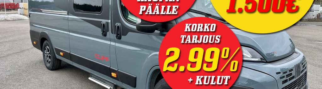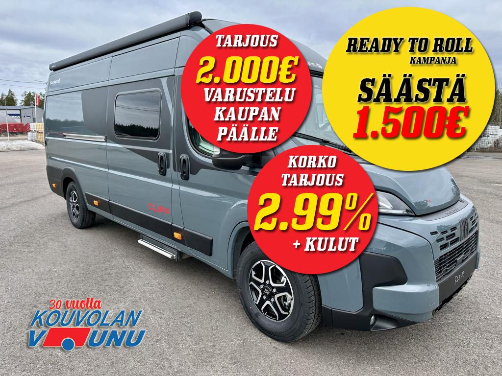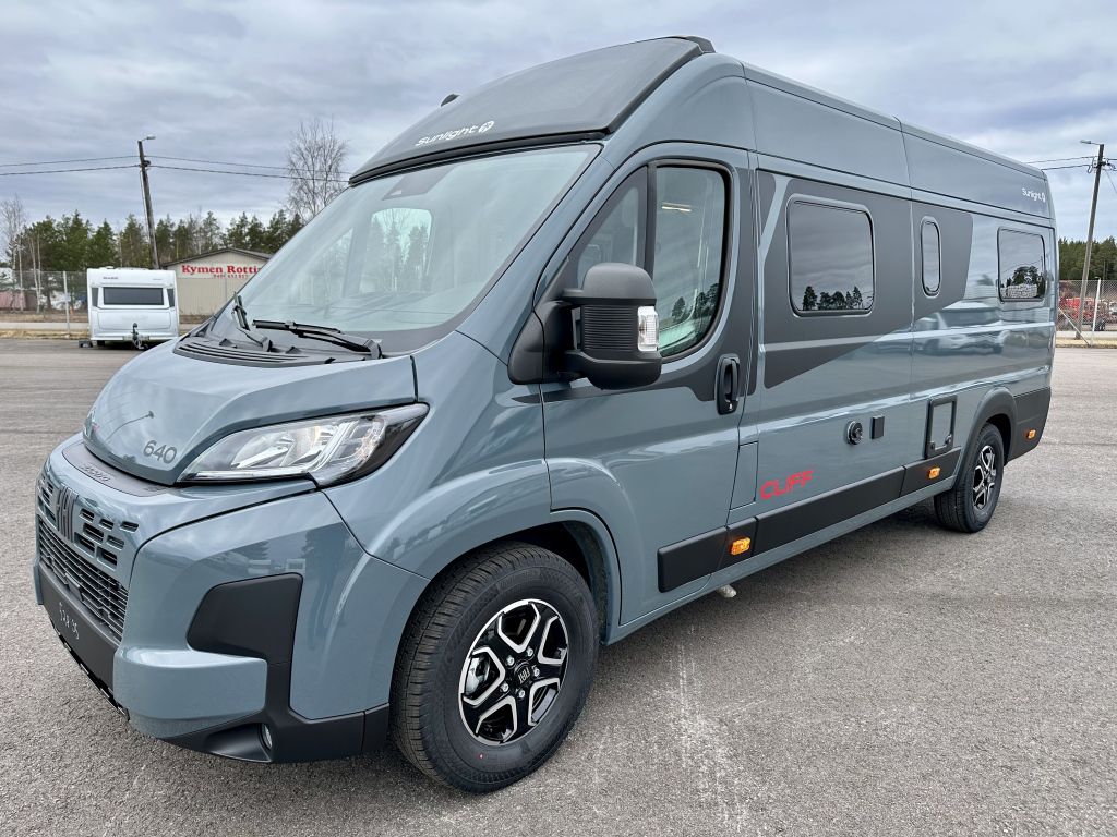 READY TO ROLL KAMPANJA TÄHÄN AUTOON ELI 1.500E POIS HINNASTA. LISÄKSI 2.000E LISÄVARUSTELU KAUPAN PÄÄLLE JA 2.99% + KULUT KIINTEÄ RAHOITUSKORKO. TARJOUKSET VOIMASSA 30.04.2026 ASTI, Cliff X- mallissa ohjaamon katto on avattu ja varustettu kattoikkunalla sekä WC:ssä liuku/paljeovi on kätevämpi pienemmässä tilassa. WC-tilassa on kääntyvä kova suihkuseinä, VARUSTEET, Fiat 140hv moottori 8-vaihteinen automaatti 3.535eur, Safety-paketti ACC 1.865eur (sis. jarruavustin joka tunnistaa jalankulkijat ja pyöräilijät - Sade- ja hämärätunnistin - Kaistavahti - Liikennemerkkien tunnistus - Kuljettajan vireystilan tunnistin - Älykäs nopeusavustin - Mukautuva vakionopeuden säädin >30 km/h), Lanzarote Grey ulkoväri 870eur, Eristetty ja lämmitetty harmaavesisäiliö 660eur, Ohjaamon kaihdinverhot 730eur, TV-valmius 240eur, Truma Combi 6E ilmakeskuslämmitys (kaasu(sähkö) sis. Digitaalinen ohjauspaneeli 785eur, Kaistavahti, Kevytmetallivanteet, Nopeusrajoitustunnistin, Eristetty harmaavesisäiliö, Ilmastointi ajotilassa, Jääkaappi, Keskuslukitus, Liesi, Suihku, Sähköpatruuna, Trumatic, Vak.nopeudensäädin