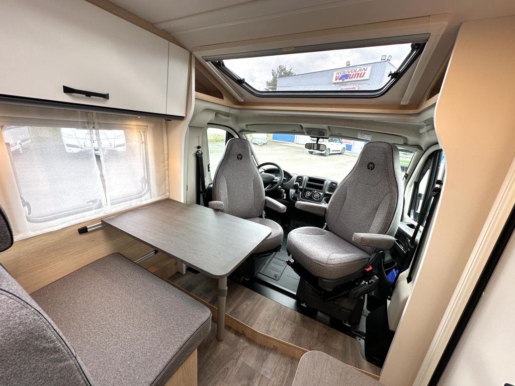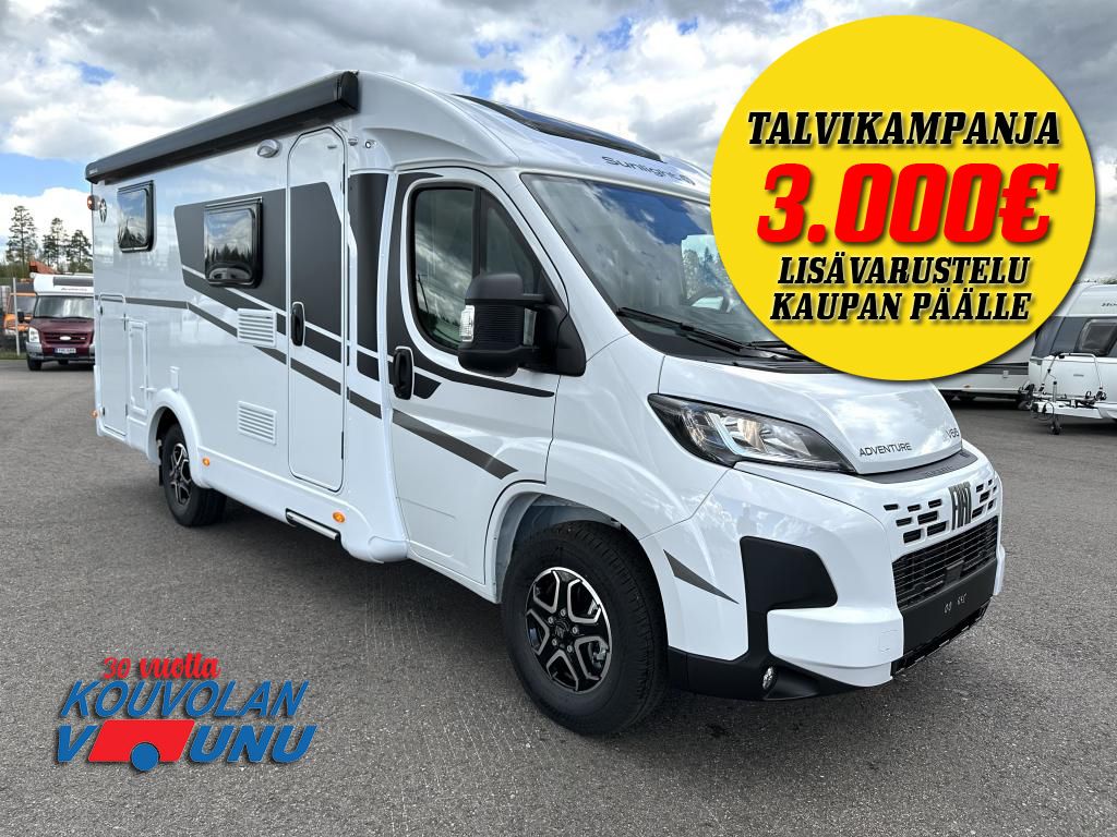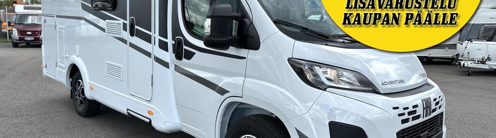 TALVITARJOUS! TÄHÄN AUTOON 3.000E LISÄVARUSTELU KAUPAN PÄÄLLE. TARJOUS VOIMASSA 27.03.2026 ASTI, Uudistunut Sunlight V66 214cm leveänä erillisvuoteilla ja nyt automaattina!, V-sarjassa yhdistyy retkiauton kompaktimmat ulkomitat sekä perinteisen matkailuauton paremmat tilaratkaisut. Auto on 20cm normaalia matkailuautoa kapeampi ja matalampi pitää silti sisällään käytännölliset erillisvuoteet joihin kulku todella vaivatonta. Vuoteiden alla iso takatalli retkivarusteille tai vaikka sähköpolkupyörille. Käytännöllinen WC muuntuu kääntöseinän avulla suihkutilaksi. Autossa valmiiksi asennettuna Continentalin kitkarenkaat ympärivuotiseen liikkumiseen eli ei tarvetta toisille renkaille, Varusteita mm.:, Adventure-erikoisteippaukset, Kattoikkuna ohjaamossa, 2. luukku takatavaratilaan, Erillisvuoteiden yhdistämismahdollisuus, One-paketti Black (markiisi, polkupyöräteline 3:lle), Valoelementti takavalopaneelin keskiosassa, Hyttysverkko-ovi (yksiosainen), Peili ja naulakko, Panoraamakattoikkuna 70 x 50 cm, Kirkaslasinen kattoluukku 40 x 40 cm, Maalattu etupuskuri, Musta alasuoja, Sumuvalot, Nahkainen ohjauspyörä ja vaihdekepin nuppi, Ilmansuuttimet hopeasomistein (Techno Trim), 16 alumiinivanteet, Perusauto 70.690eur, Fiat 3500kg 140hv 8-vaihteinen automaatti 3.575eur, Puinen suihkuritilä 100eur, Ohjaamon kaihdinverhot 735eur, Asuinosan mattosarja 325eur, Eristetty harmaavesisäiliö 200eur, TV-valmius 245eur, Sähköinen lattialämmitys 560eur, Truma Combi 6E sähkölämmitys + digipaneeli 795eur, Performace Grey-verhoilu, Airbag, Eristetty harmaavesisäiliö, Ilmastointi ajotilassa, Ilmastointi man., Kasetti WC, Keskuslukitus, Keskuslukitus kaukosäädöllä, Keskuslämmitys, Lattialämmitys, Lattiamatot asunto-osassa, Lämminvesiboileri, Markiisi, Ohjaustehostin, Suihku, Sähkökäyttöiset ikkunat, Sähköpatruuna, Sähköpeilit, Trumatic, Turbo, Vak.nopeudensäädin