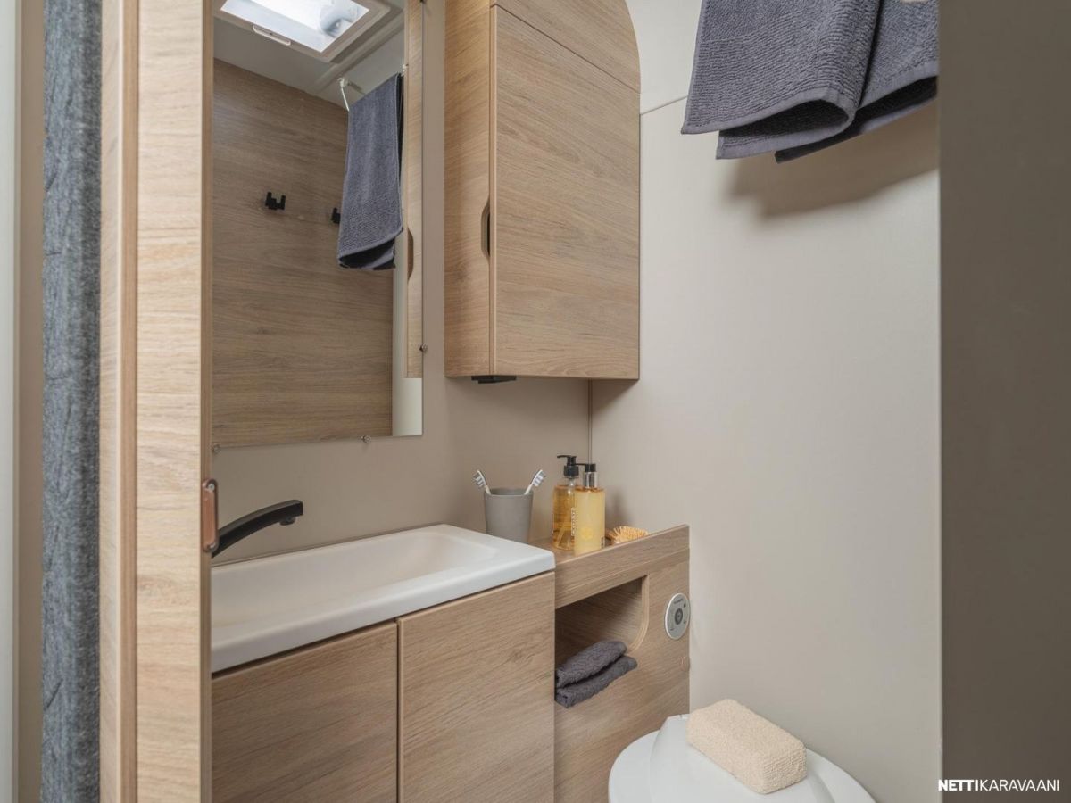 Kattoluukku, Trumatic, Kasetti WC, Lämminvesiboileri, Liesi, Jääkaappi, Pakastelokero, Kasettiverhot, Tukijalat, Lattiamatot asunto-osassa, Pesuallas, Sähköpatruuna